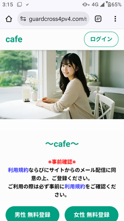普通は特商法表記やトップページの最下部に各種届出の記載があります。その記載がないということは未届なのでしょう。この時点でcafeがサクラサイトであることは確定しました。