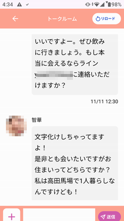 私と宅飲みがしたいそうです。そこまで私のことを気に入ってくれているのなら、連絡先の交換くらいはできるはず。というわけでLINEのIDを送ってみたのですが文字化けしていると言われてしまいました。