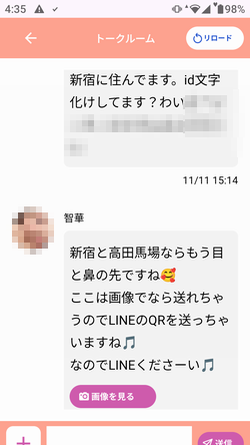 私はこのサクラが送ってきた画像もチェックしようとしましたが、ポイントが不足していて見ることができませんでした。ポイントがちょうど足りなくなるタイミングで画像を送り、ポイント購入を促すのがこのアプリのサクラの手口であるみたいです。