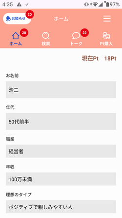 このアプリでも私はプロフィールを適当に設定し、2、3日放置してみました。ちなみに私のプロフィールは、