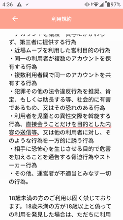 直接会うことだけを目的とした内容の送信は禁止と記載されていました。出会い系でも何でもないただのチャットアプリが、送信1通250円もの料金を設定しているのですから、恐ろしいとしか言いようがないです。