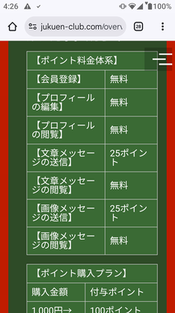 メッセージの送信が1通250円となっています。サクラサイトか否かのボーダーラインは送信1通100円であるわけですが、熟宴クラブはその2.5倍もの料金を設定しているのです。これを見るだけでも熟宴クラブがサクラサイトであることがよくわかりますね。