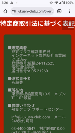 出会い系サイトの営業を行うにはこの届出が必須。そして届出を行った場合にはその旨をサイトのいずれかの部分に記載するのが通例です。サクラサイトはこの届出を怠っていることが多く、それら未届のサイトに比べれば、熟宴クラブは多少はマシと言えそうですね。
